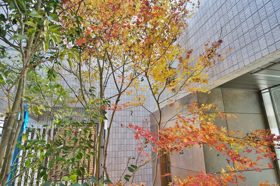 エントランスに植えられた日本の美を象徴するモミジが、住まい手や来客を毎日出迎えてくれる。