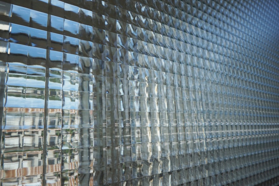 チェッカーガラスもしくはワッフルガラスと呼ばれているガラス。こゆるぎこまちの一つの家には、吹き抜けにこのガラスを使っています。夜間、室内の照明を点灯させることで、シャンデリアのように光が拡散し、吹き抜けのFIX窓から優しい光が広がるような工夫があります。